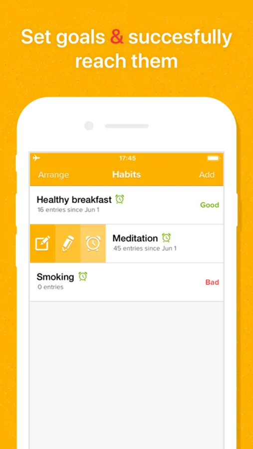 #2. Habit is so much flexible and easy to use you'll be amazed. No complicated stuff inside, no complex settings. Add a habit and start changing it in 15 sec or less! Forgot adding previous records? No worry - do it you when your prefer - you can edit previous days records any time. Reminders will help you to bring you back to the righteous route ;-)