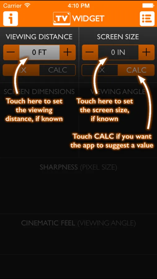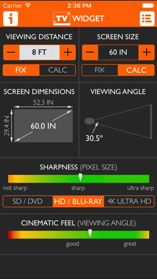 3. Assess the viewing experience. TV Widget calculates the viewing angle and provides fun gauges that help you assess how big the picture will feel compared to a cinema/theatre.