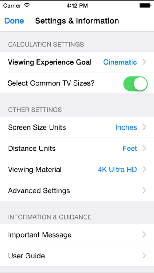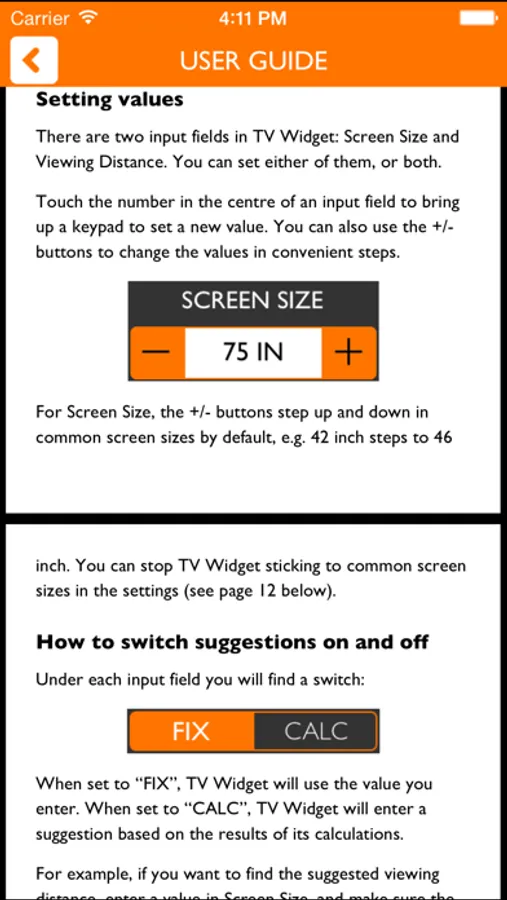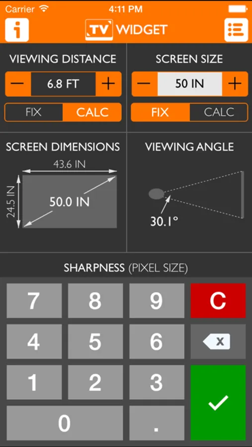 TV Widget is a fun and informative app for learning about the relationship between screen size, viewing distance and viewing angle. You can use it to help inform your decision about what size TV to buy, or how to arrange the seating in your room.