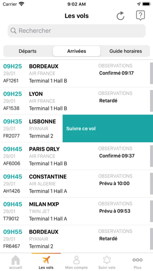 Retrouvez tous les statuts des vols au départ et à l’arrivée.