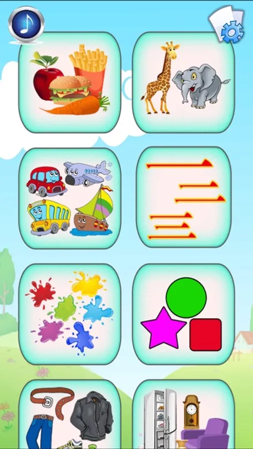 Categories include: Food items, Animals, Transportation, Numbers, Colors & Shapes, Clothing, Household items, Body Parts, Outdoor items, Music Instruments/Arts & Learning.