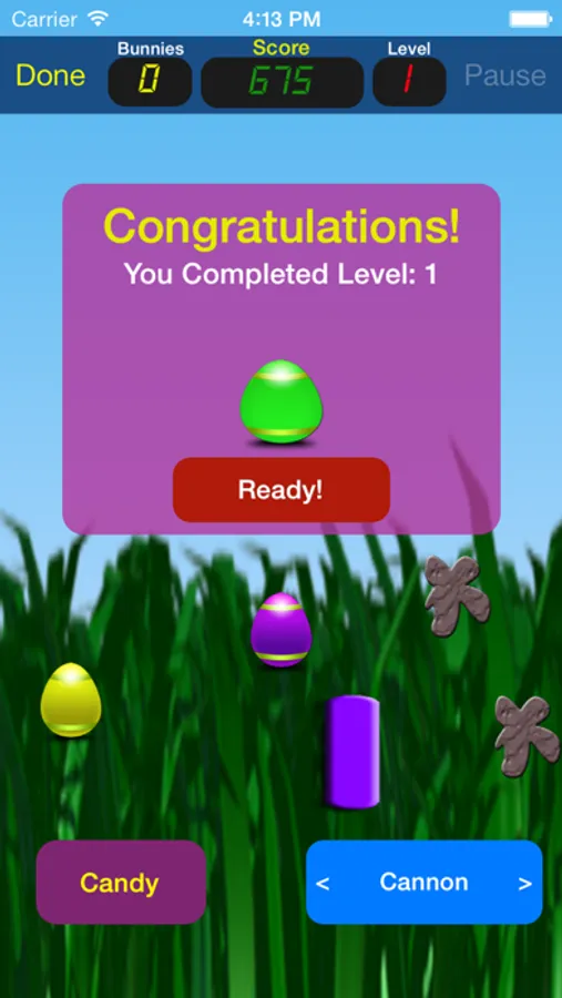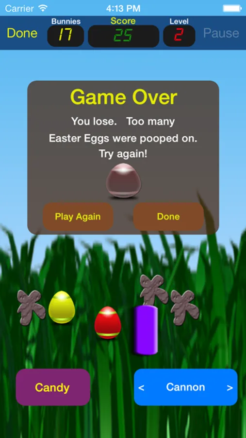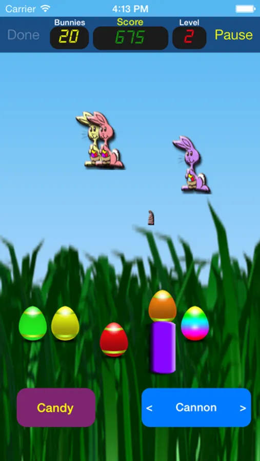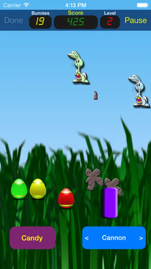 To stop the bunnies use your candy cannon to shoot candy at the bunnies. If you hit a bunny, it will explode and you will get 50 points for each bunny you hit. You will lose 25 points for each bunny that flies off the screen without getting hit. To complete each level, just hit the number of bunnies required. To win, complete all the levels to save Easter.