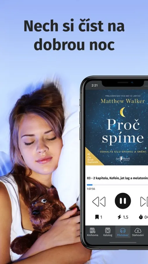 - Pohodlné přehrávání a synchronizaci mezi zařízeními. Posloucháte na telefonu a chcete pokračovat na tabletu? Aplikace si sama pamatuje, kde jste skončili.