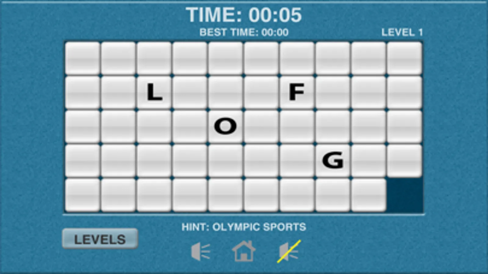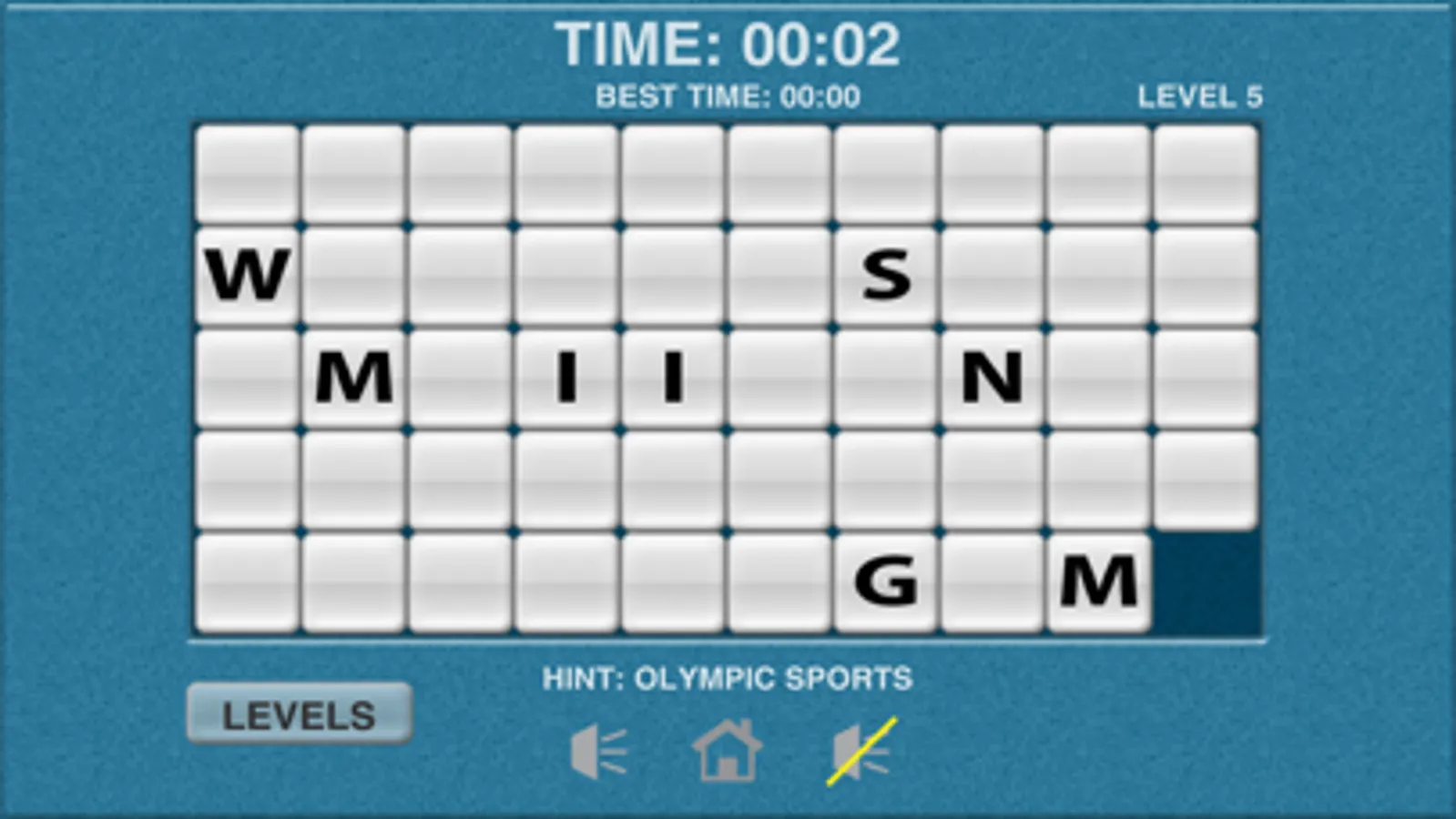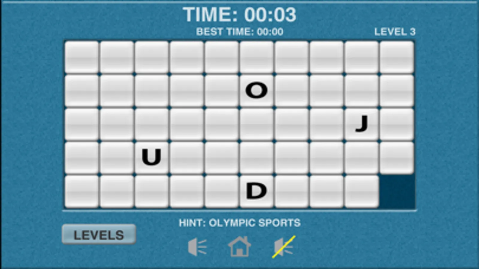 Sports Word Slide Puzzle is a puzzle game in which you need to solve the word puzzle and in the least amount of time possible. Each slide puzzle contains an Olympic sport name to solve. Touch a tile to slide it into an open adjacent space. You must rearrange the letter tiles to spell the word for that level to unlock the next level. The word must be horizontal and in the same row. After 60 minutes you will have to restart the level.