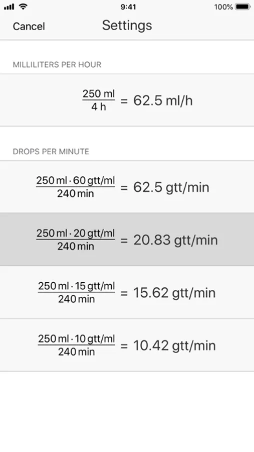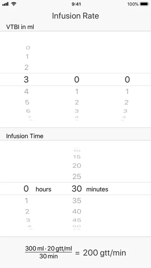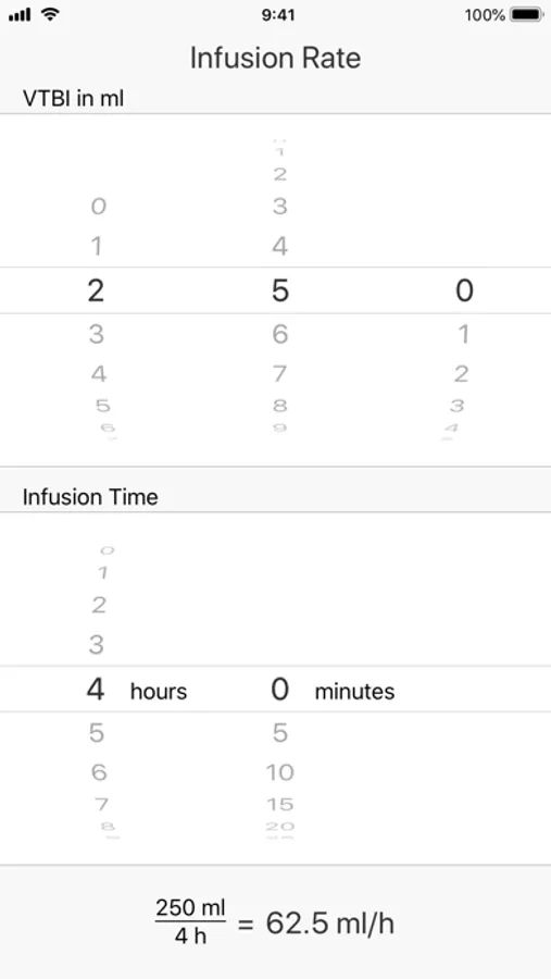 Given the volume to be infused (VTBI) and the infusion time this app calculates the required infusion rate in ml/h.