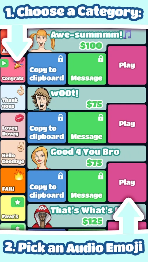•Use the “Copy to Clipboard” button located on every Audio Emoji to copy that Audio Emoji to your clipboard. From there you can paste into any app that lets you paste of movies
