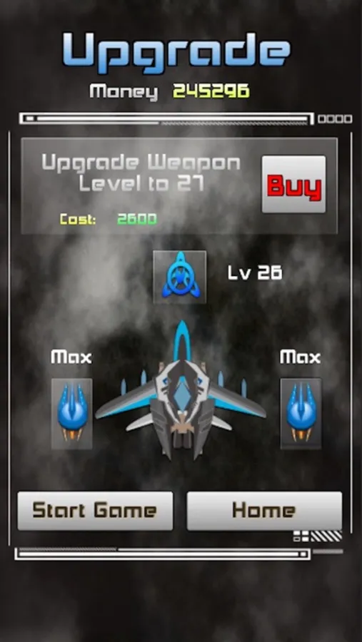 2. Tap the fighter jet into the next screen. This screen, the top appear the current cumulative money of fighter jet. The middle appear the level and weapon status of fighters. Also there is the option to upgrade the aircraft. Below, tap the "Start Game" botton to start the game, tap "Home" botton to return the main menu to reselect fighter type.