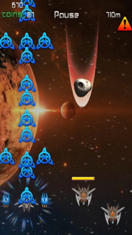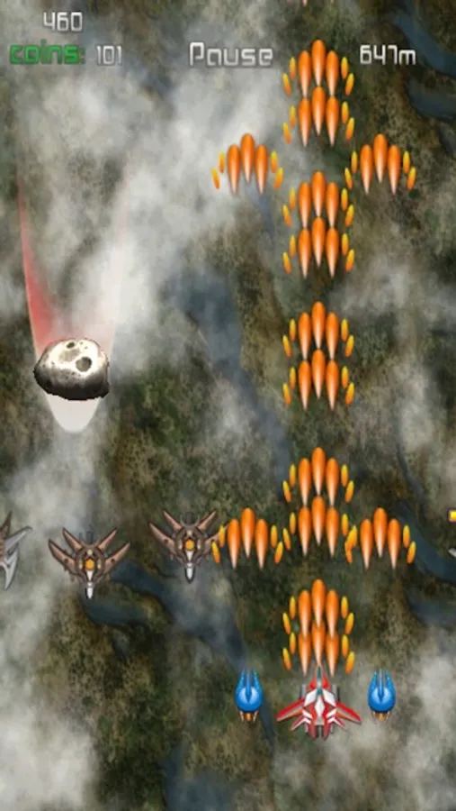 The purpose of the game is to destroy the enemy, and avoid the meteorite impact, in order to challenge the longest flight mileage . The fighter jets will continue to fly and fired weapons, you should just touch panel to adjust the left or right direction of travel, to facilitate the attack or dodge. Each enemy aircraft bombed will release energy, collect the energy could increase weapons energy temporarily, or accelerate the flight speed temporarily, or money awards. Money can be used to upgrade the level of user's fighter jets. When fighter get higher level, it could get better weapons. There are three different colors of fighter aircrafts in this game, they are different systems, flight experience and money obtained could not be shared . Before the meteorite falls, a warning sign will appear to prompt.
