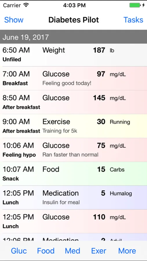 - Records glucose (mg/dL or mmol/L), medications, meals, exercise, blood pressure, weight, and notes about test results or any other information that's of interest to you.