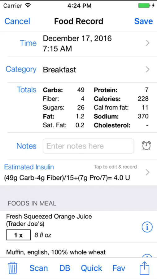 - Includes a continuously updated food database with reference information on hundreds of thousands of foods. Track carbohydrates, calories, fat, protein, fiber, sodium, cholesterol and other nutrients. Scan barcodes on food packages to add foods to your record!