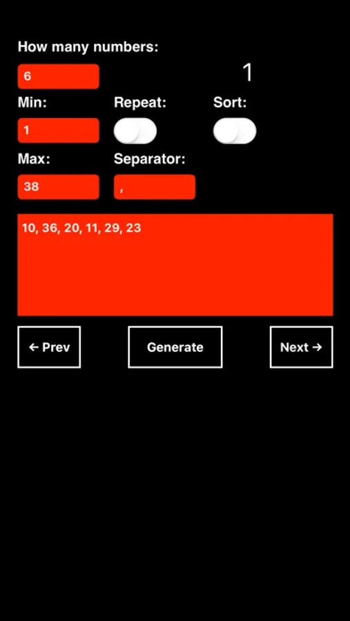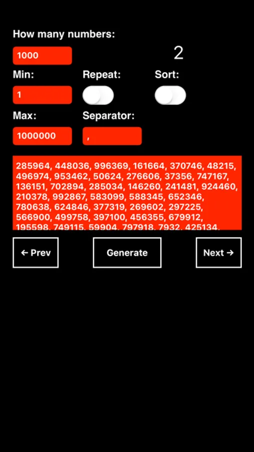 - If you tap "Generate" several times, the previous generated numbers are stored in memory and you can review the different results by tapping the "Prev" and "Next" buttons.