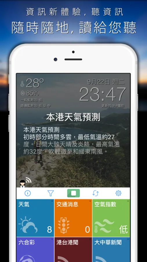 資訊新體驗,點擊收聽資訊。隨時隨地,讀給您聽。此APP會為用戶朗讀新聞和各類資訊,利用開放的各種資訊,如天氣、交通等等,最適合早上返工前用。