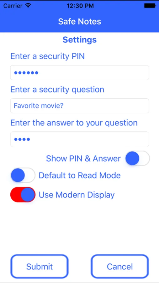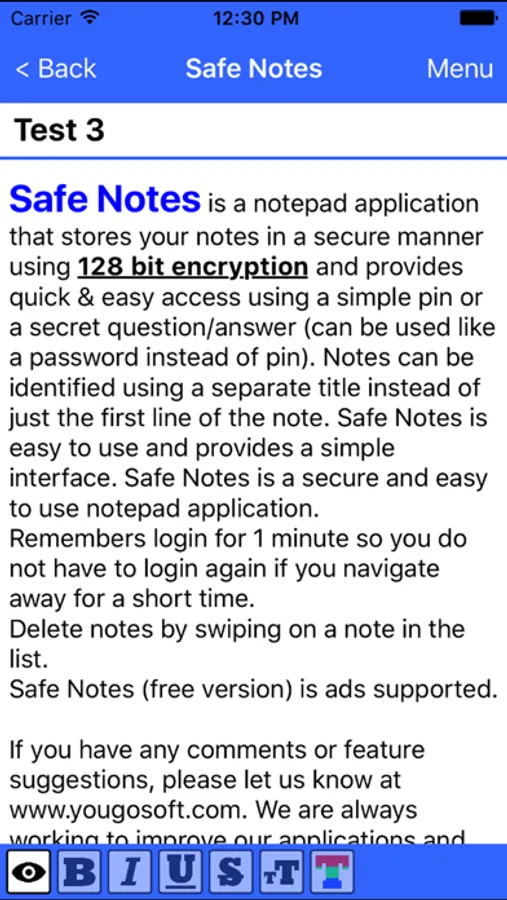 Safe Notes is a notepad application that stores your notes in a secure manner using 128 bit encryption and provides quick & easy access using a simple PIN or a secret question/answer (can be used like a password instead of PIN). Notes can be identified using a separate title instead of just the first line of the note. Safe Notes is easy to use and provides a simple interface. Safe Notes is a secure and easy to use notepad application.