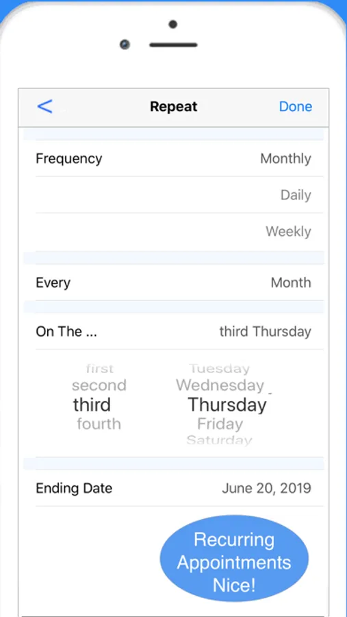Repeating Appointments - Full support for Weekly, Monthly & Daily repeating appointments. can specify ending date or never. Completing appointments does not alter future appointment. Entry is simplified compared to the devices Calendar app.
