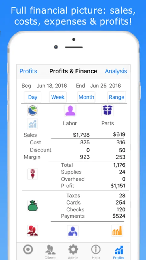Profits provides a complete financial system that tracks all sales, purchases and expenses. Includes ALL formatted PDF Reports that can be directly printed or attached to emails.