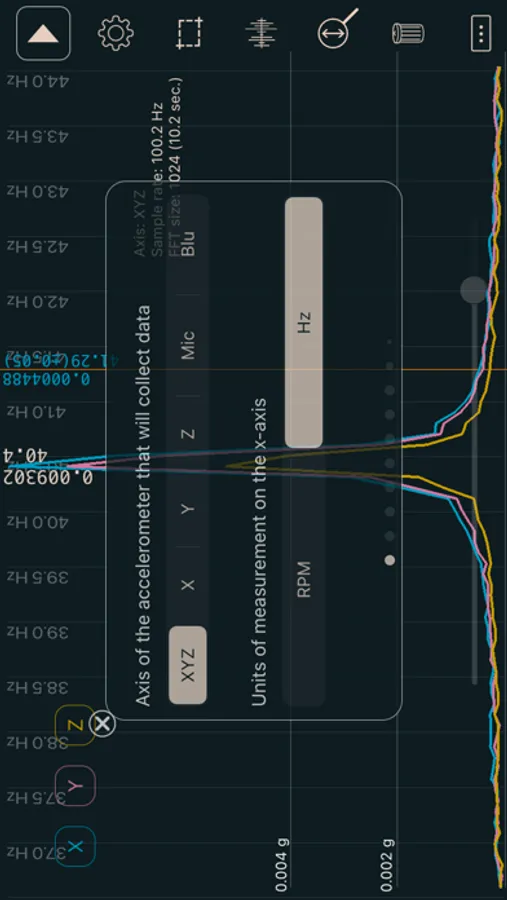 • The choice of units of measurement. X-axis: Hz or RPM. Y-axis: g, m/s², ft/s², mm/s, in/s (ips), mm, mil, dB(A), dB(V).