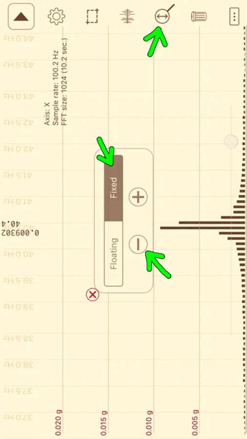 • FFT size (for built-in accelerometer): 64, 128, 256, 512, 1024, 2048, 4096 (data collection time from 0.64 sec. to 40 sec.). For an accelerometer connected to the headphone jack FFT size from 2048 to 131072. For Bluetooth-accelerometer FFT size from 512 to 32768.