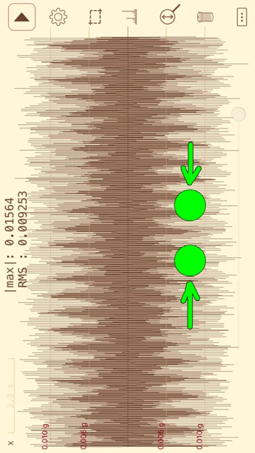 • Root mean square (RMS, for vibration) or average value (AVG, for absolute values) for vibration wave. Values are calculated only for data displayed on the screen.