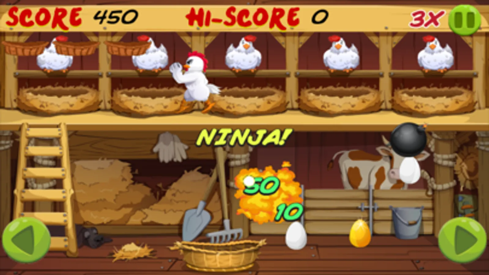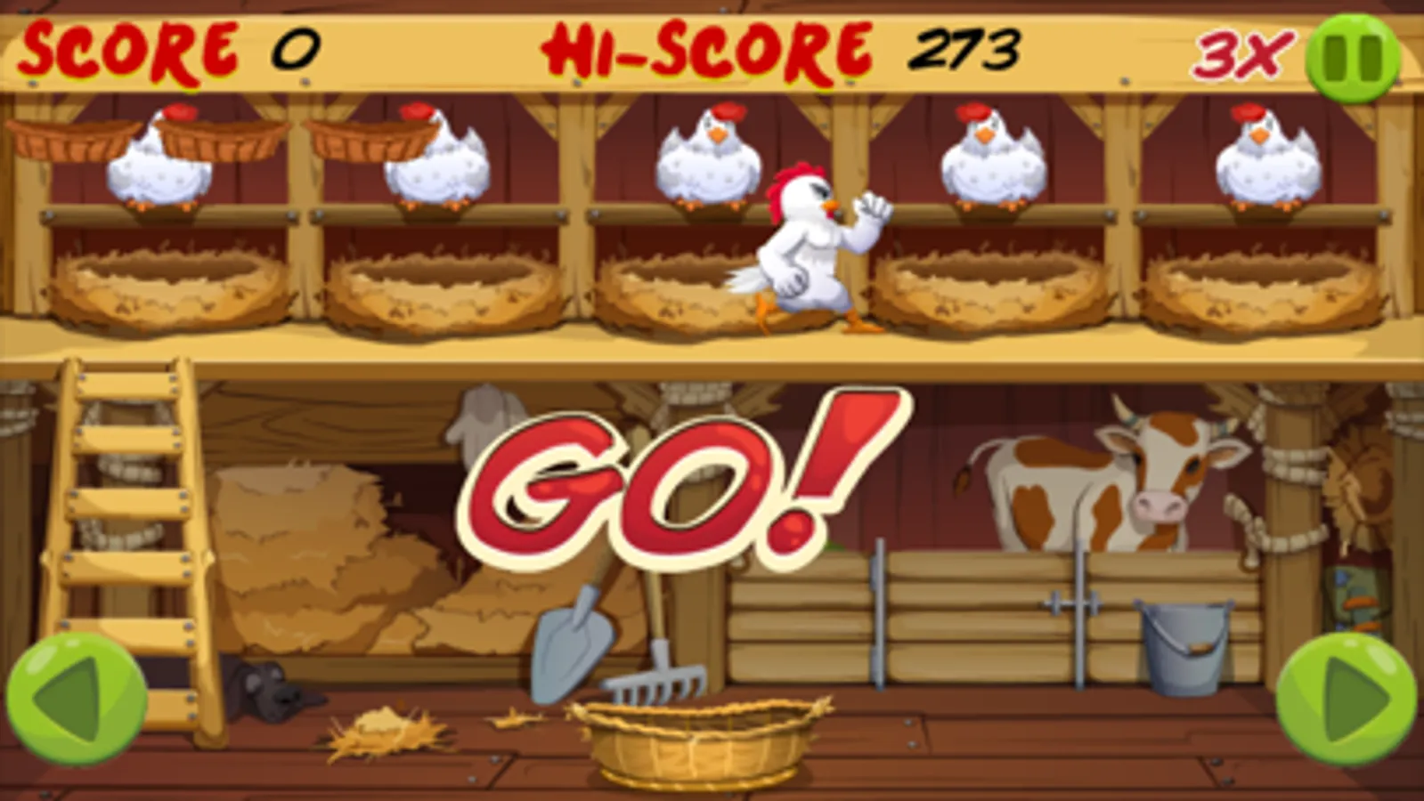 Your quest is to race against the crazy chicken that drops eggs, called ' Angry Chicken ' and become an egg catching ninja! Catch as many eggs as you can while they drop, avoid the bad stuff and use the super power eggs to your advantage. If you miss 3 eggs and they drop down, you lose.