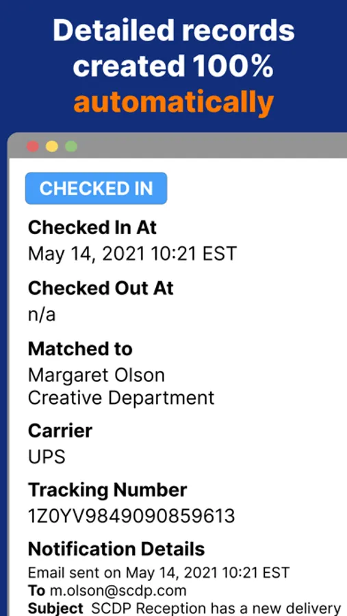 Simply snap a picture to automatically log any delivery, notify the right recipient, and create a fully searchable record. It’s that simple!