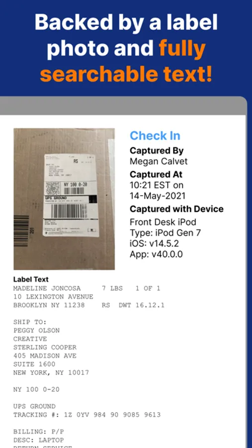 Every record is backed by a photo and fully searchable text of every word on any label. Search for ANYTHING on the label, not just the name or tracking number. That includes order, reference, RMA, PO, and inventory numbers, as well as any sender info.