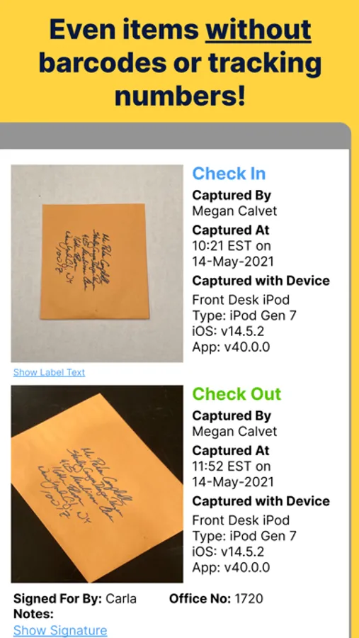 No matter the delivery, simply snap a photo of a delivery label when an item enters or leaves your custody.