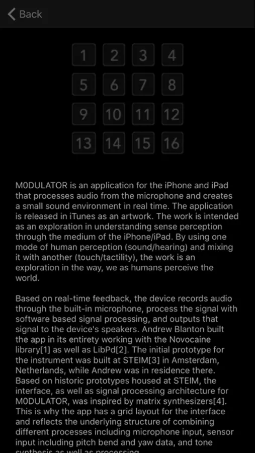 M0DULATOR creates a series of micro sound environments for the iPhone and iPad. The entire work is an exploration in feedback loops and the tactility of sound. Based on previous works that have been released in iTunes by Andrew Blanton, M0DULATOR is an artwork and system designed explore the physical nature of sound through real time signal processing.