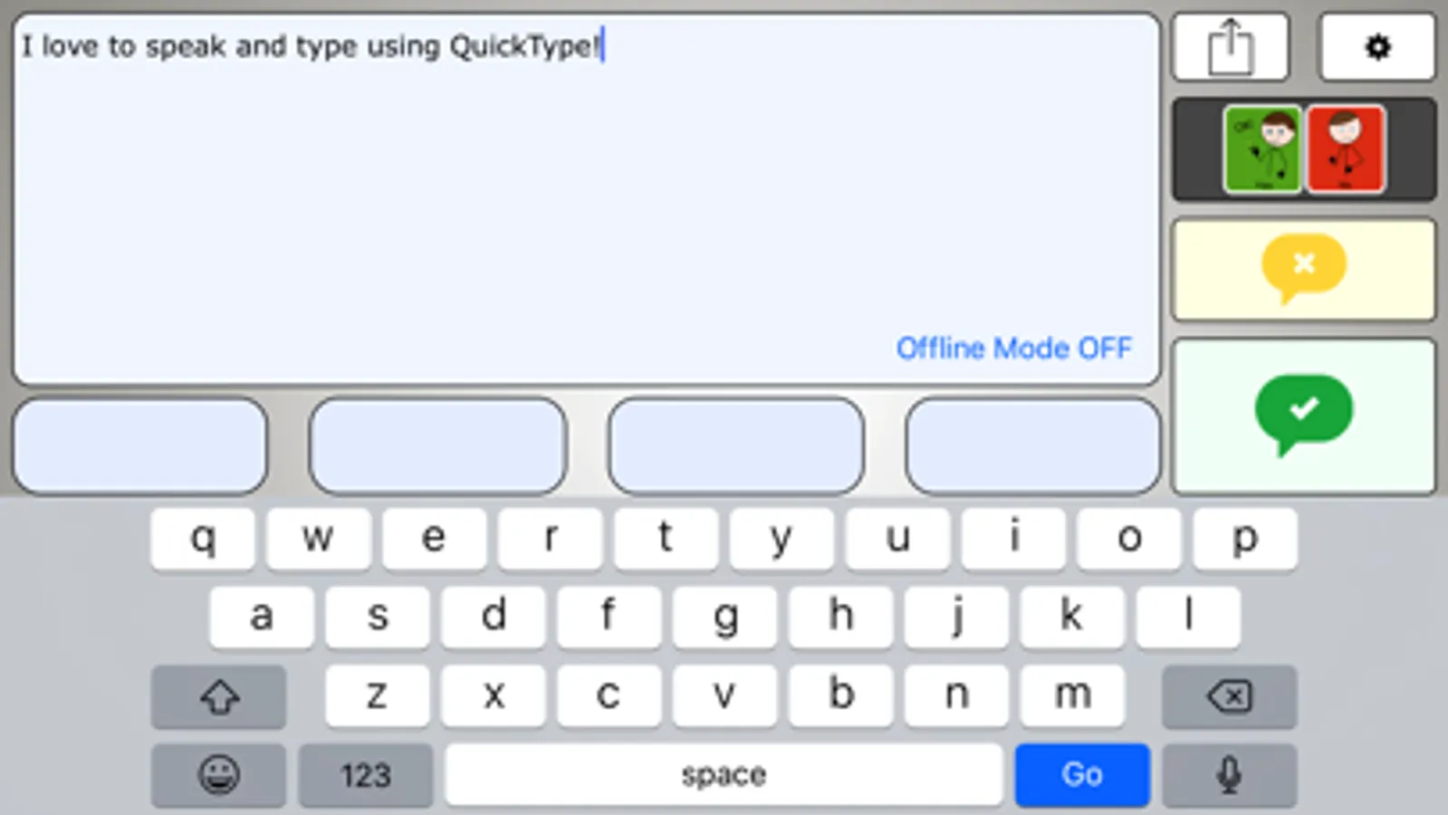 We designed Quick Type as an affordable, easy-to-use alternative to many of the typical Augmentative and Alternative Communication (AAC) apps and devices currently available. It has been designed for those who with cerebral palsy, apraxia, down syndrome, autism, Lou Gehrig's Disease (ALS) and any other condition which causes an individual to be low or non-verbal.
