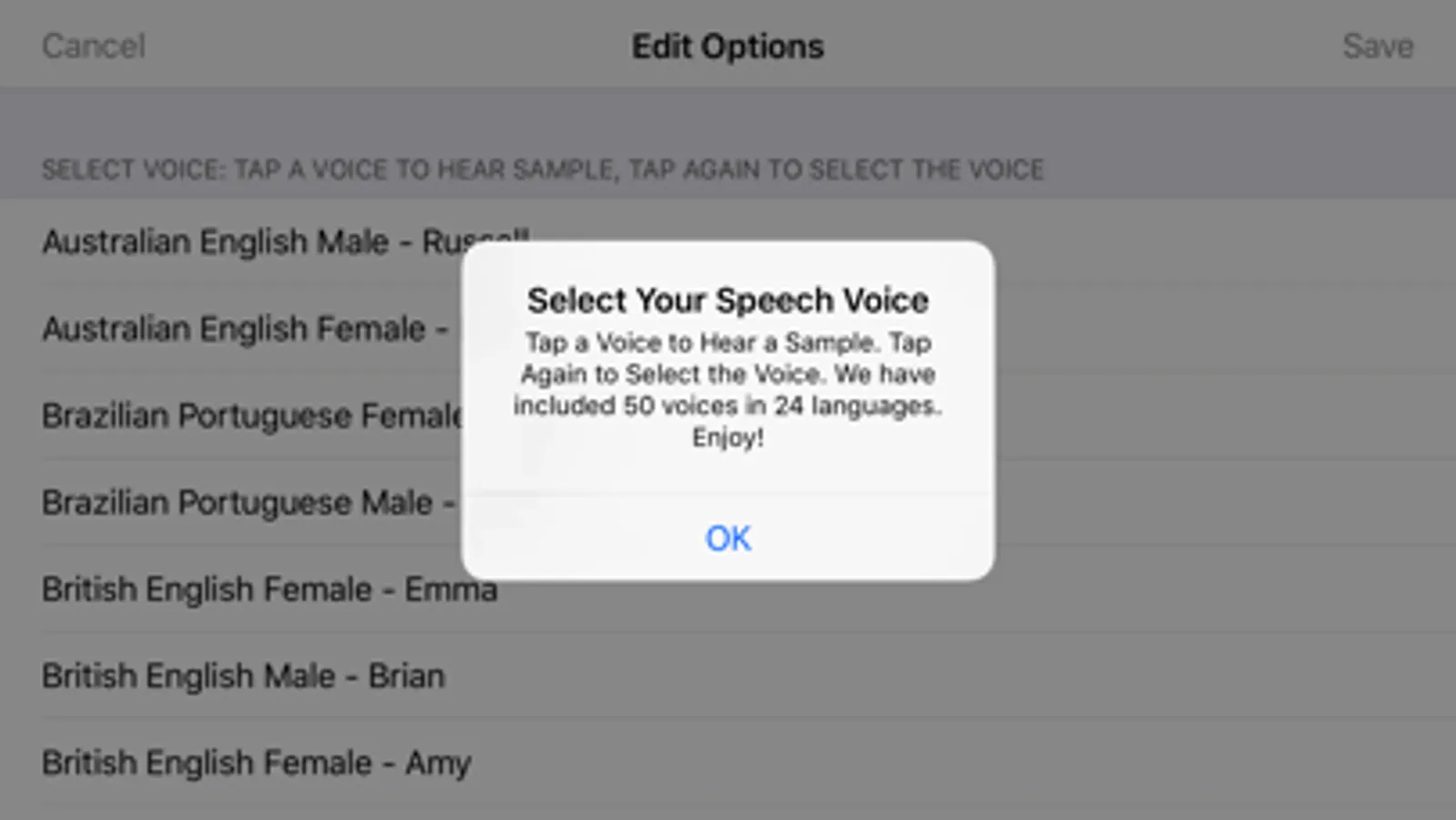 We have included 50 high-quality voices in 24 languages for you to choose from. You can also choose to speak automatically after typing a word or sentence, if you wish. You can also share your current speech or an entire conversation via email, Facebook, or Twitter which allows you to save important conversations or share them with friends and family.