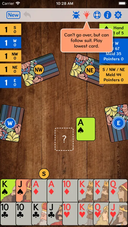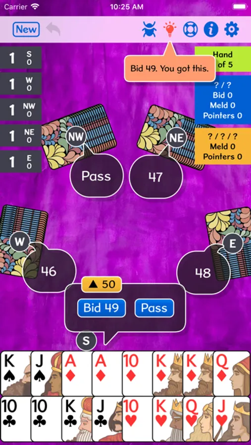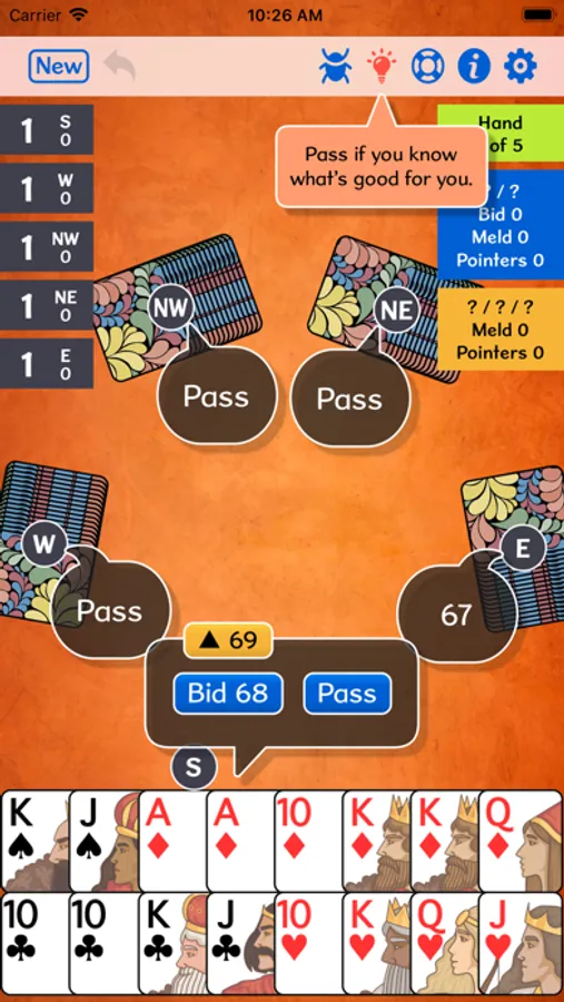 This is a 5-handed trick-taking card game app that will be easy to learn for all pinochle players. Growing up in a house full of pinochle players, there were many times we had exactly 5 players -- so my family invented this 5-handed game. It uses a double pinochle deck with 9s removed. Each player is dealt 16 cards, and the bidding begins at 40, 45, or 50.