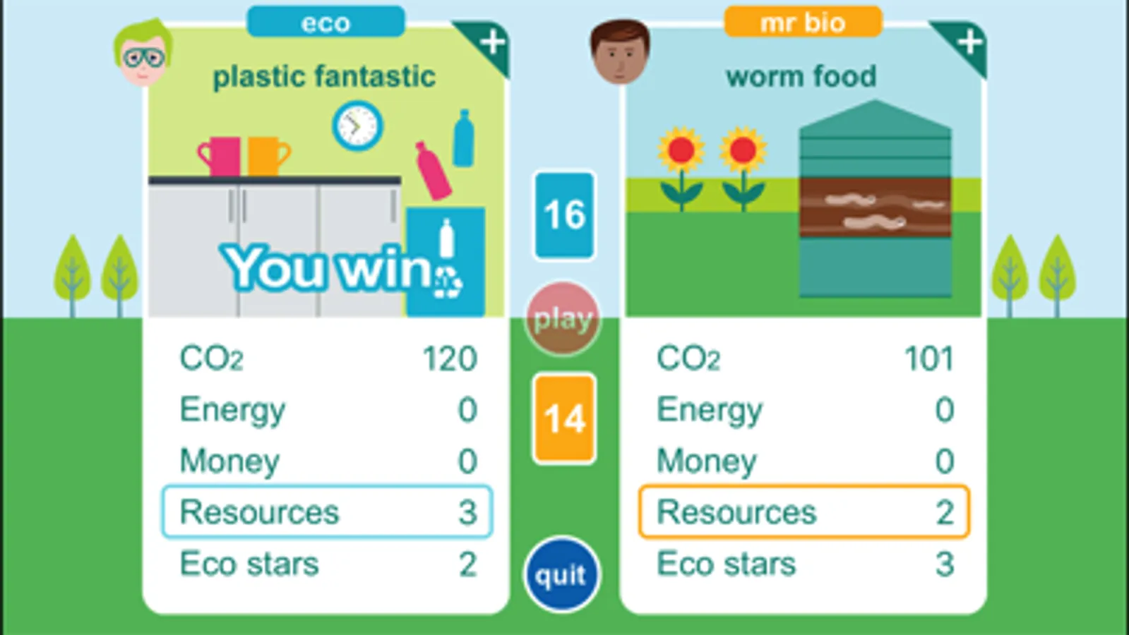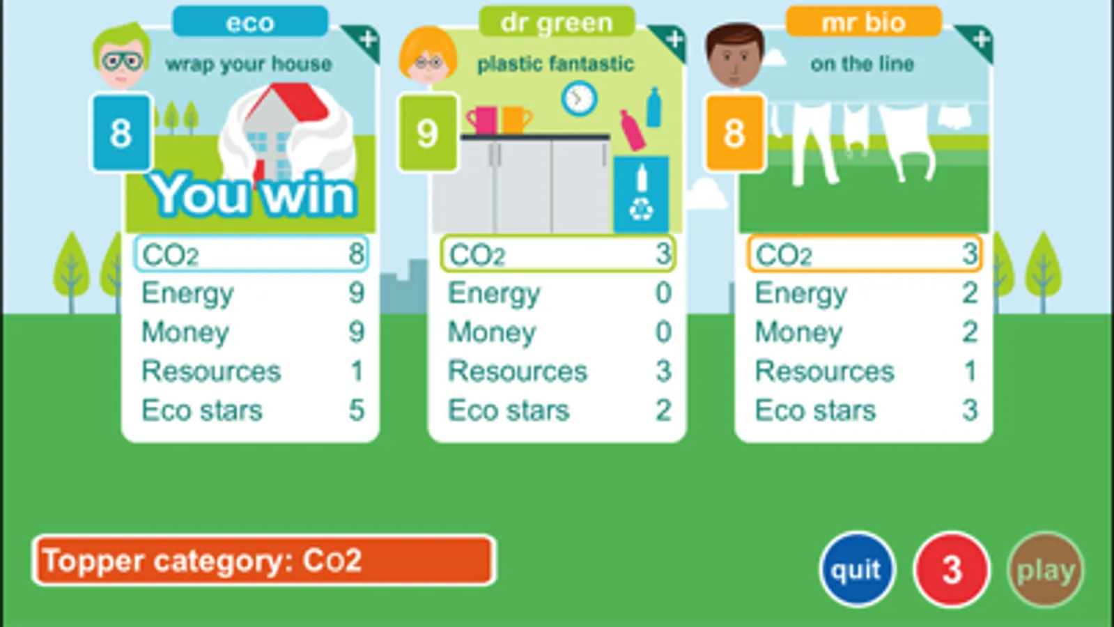 Eco Action Toppers takes its inspiration from the traditional Top Trumps™ game, where you pit your wits against your opponent to pick the highest value category on your card to beat your opponent(s) and take their card(s).