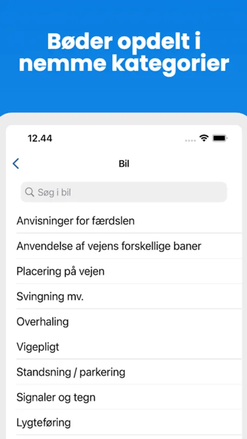 Slå de forkellige bøder op i forskellige kategorier og ved hjælp af søgning.