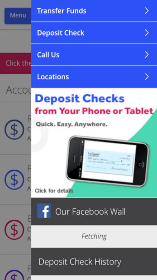 Our Mobile Banking application allows you to check balances, transfer funds, view transactions and check messages from anywhere, anytime. It's fast, free and available to all of our Online Banking users. With this app you can do the following: