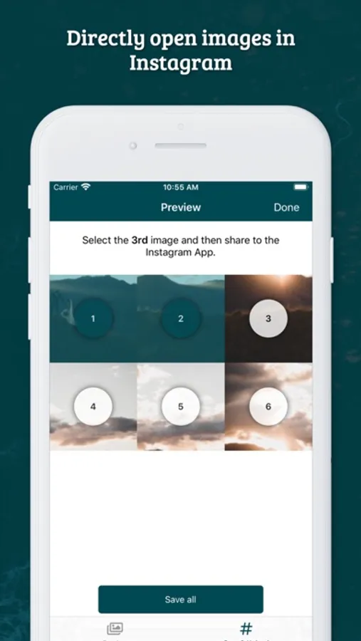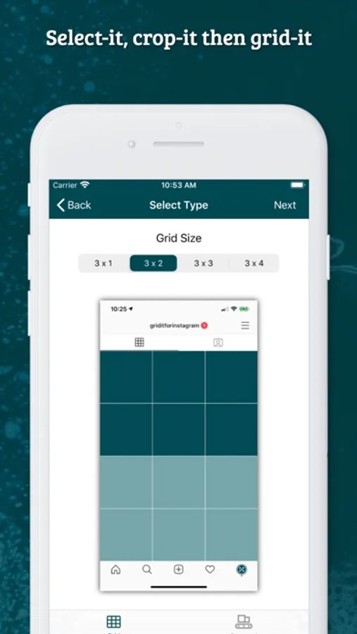Simply select the number of rows you would like to cover on your gallery 3x1, 3x2, 3x3 or 3x4, add a photo, and then rotate, crop and zoom it to size. Once you’re done, grid-it will split the image into Instagram sized tiles and guide you through the order to share each image to Instagram.