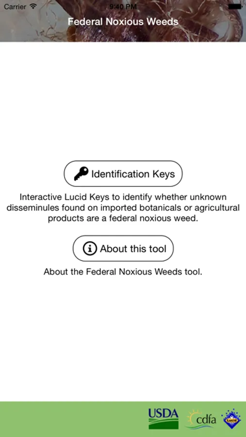 Officials in the United States Department of Agriculture (USDA) have determined that certain species not native to the U.S. are at risk of becoming invasive should they enter this country. As part of its effort to prevent the introduction of invasive or potentially invasive weeds, the USDA maintains an official list of "federal noxious weeds" (FNW) (7 CFR 360.200 and 361.6). Many taxa on this list are currently serious weeds elsewhere in the world, and about two-thirds of the taxa are currently found in the U.S. Most of the FNW taxa are angiosperms, but a few are ferns and one is a green alga. NOTE that the ferns and alga are not included in this app.