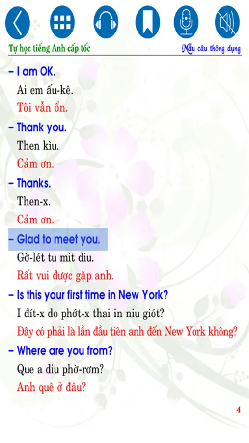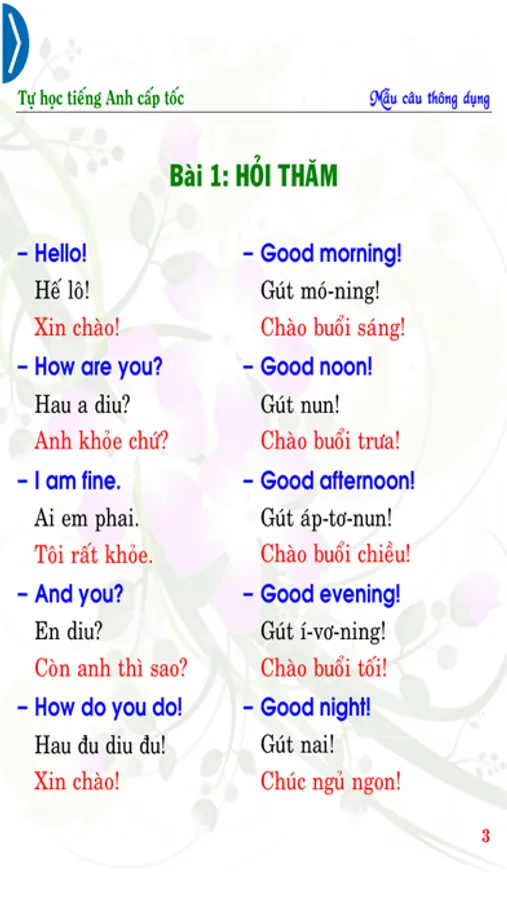 Quyển sách “Tự học tiếng Anh cấp tốc – Mẫu câu thông dụng Anh – Việt” gồm 146 trang hoàn toàn miễn phí để ai ai cũng có thể sử dụng Sách Thông Minh - SmartBooks của chúng tôi. Sách được thực hiện theo tiêu chí phiên âm theo cách đọc của người Việt và dùng để học mọi lúc mọi nơi khi trong tay có chiếc điện thoại thông minh. Trong quá trình biên soạn không khó tránh khỏi những sai sót ngoài mong muốn, hy vọng sự đóng góp quý báu từ các bạn giúp quyển sách ngày càng hoàn chỉnh hơn. Xin chân thành cảm ơn và chúc các bạn học tập hiệu quả! Những tiện ích khi bạn sử dụng Sách Thông Minh - SmartBooks của chúng tôi: Sách được tích hợp âm thanh (audio) vào trong sách, đánh dấu từng câu khi đọc, khi cần nghe lại câu vừa mới đọc hay câu nào đó thì bạn chỉ cần chạm tay vào câu đó thì sẽ phát âm thanh; Ngoài ra SmartBooks còn có tính năng thu lại giọng đọc (giọng của bạn tập đọc câu vừa học, vừa nghe) của bạn bằng cách nhấn vào nút Recorder (icon Micro), khi bạn nhấn vào icon “Headphone” “Nghe và viết”, xuất hiện màn hình có rất nhiều tính năng giúp bạn nghe và viết lại câu vừa nghe bằng phím hay bằng tay,… Sách được thiết kế để sử dụng mọi lúc mọi nơi khi trong tay bạn có chiếc Smart Phone. Đây là một bước đột phá của chúng tôi trong thời đại công nghệ số nó sẽ giúp các bạn rất nhiều trong việc học và đọc sách.