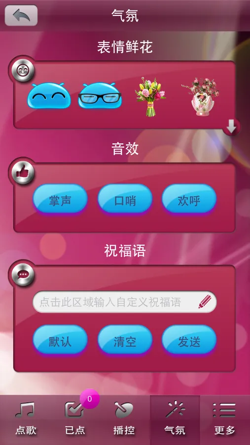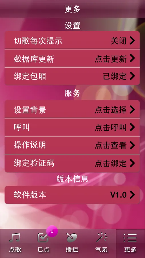 本应用是一款可以在KTV场所或家庭点歌机进行无线点歌的软件。但是本应用只能在本公司的VOD产品上使用,根据场所提供的包厢二维码信息绑定包厢后,可以进行无线控制,主要功能是:点歌,切歌,音量大小控制,查看点歌列表,发送气氛等。可以多人同时点歌,避免争夺点歌触摸屏的尴尬局面。