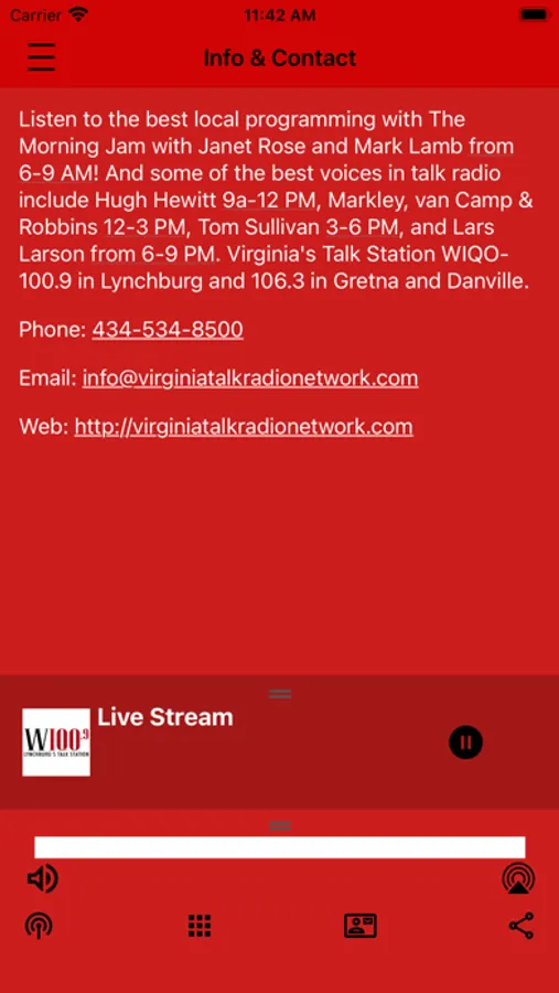 Listen to the best local programming with The Morning Jam with Janet Rose and Mark Lamb from 7-9 AM! And some of the best voices in talk radio include Hugh Hewit 9a-12 PM, Markley, van Camp & Robbins 12-3 PM, Tom Sullivan 3-6 PM, Lars Larson from 6-9 PM, and John Batchelor 9p-1a. Virginia's Talk Station WIQO- 100.9 in Lynchburg and 106.3 on the Southside
