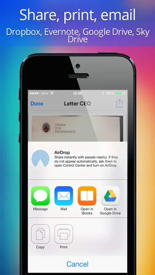 * Export, email, print and share your scanned documents with Dropbox, Google Drive, Evernote and other service support.