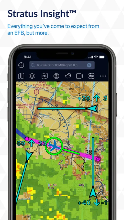 Stratus Insight is a full electronic flight bag (EFB) suite for pilots that includes AHRS with synthetic vision, TAWS, VFR sectional maps, IFR low/high charts, and geo-referenced approach plates.