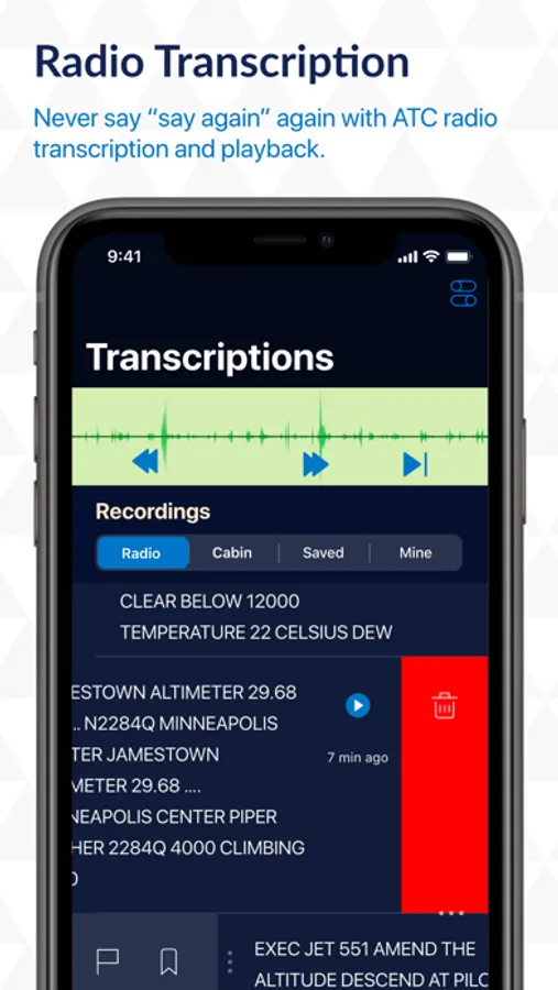 Stratus Insight boasts a custom-built speech recognition system inside the app. When paired with a Stratus Audio Cable, the ATC Radio Transcription feature works similar to visual voicemail. ATC communications are converted into text, providing a helpful visual assist for referencing previous audio clips. This enables pilots to receive a clearance, ATIS, or other important ATC communications without needing to write them down