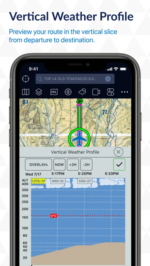 The Vertical Weather Profile previews your route in the vertical slice from departure to destination, up to eight days out, so you can see the conditions you’ll encounter based on your departure time, aircraft speed, and each intermediate airport.