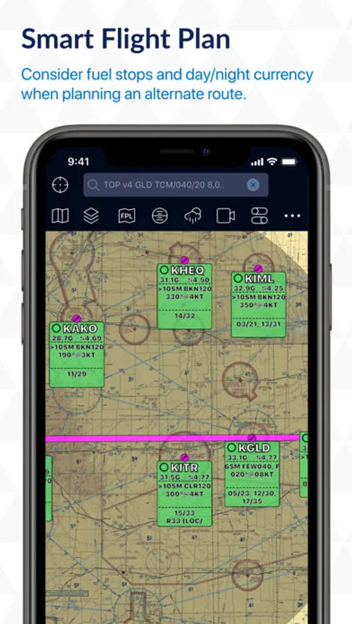 If a TFR or changes in weather force you to take an alternate route, the Smart Flight Plan tool considers things like fuel stops and day/night currency.