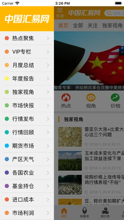 汇易网APP是汇集饲料原料行情资讯,价格趋势等为主体内容的大型农产品信息的网站,上海汇易咨询股份有限公司是一支拥有多种知识结构人才的优秀团队,积累着丰富的国内外期现货经验,以相应的专家队伍为外围依托,及时把握市场行情动向,秉承JCI一贯平实的经营理念:"与团队一道经风雨,和客户一同见彩虹",是每一个JCI人不变的承诺。作为当代信息咨询工作者,我们坚信:提供成熟的专业化资讯和不断为客户增值的服务,将是我们汇易人永远追求的最高目标,因为专业性的资讯中总是蕴藏着特殊的价值。我们遵循"走在市场前面,为客户发现价值",是我们汇易人始终不渝的使命。