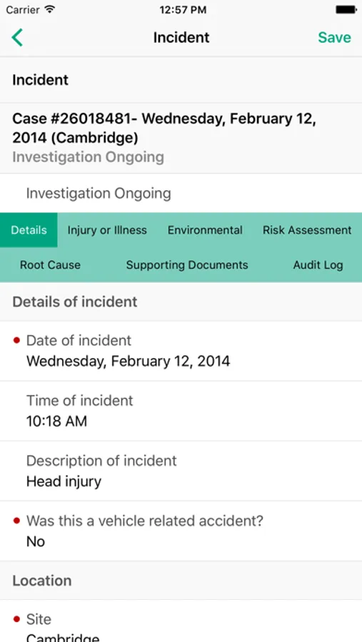 Save details as you go, including attaching photos or other documents as evidence, and your responses will automatically synchronise with your UL EHSS site the next time you’re online. You or your colleagues can continue the incident workflow to investigate the root causes and assign corrective and preventative actions.