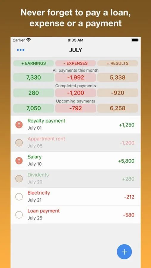 Enter your monthly expenses to be paid throughout the month. Expenses are highlighted in red.
