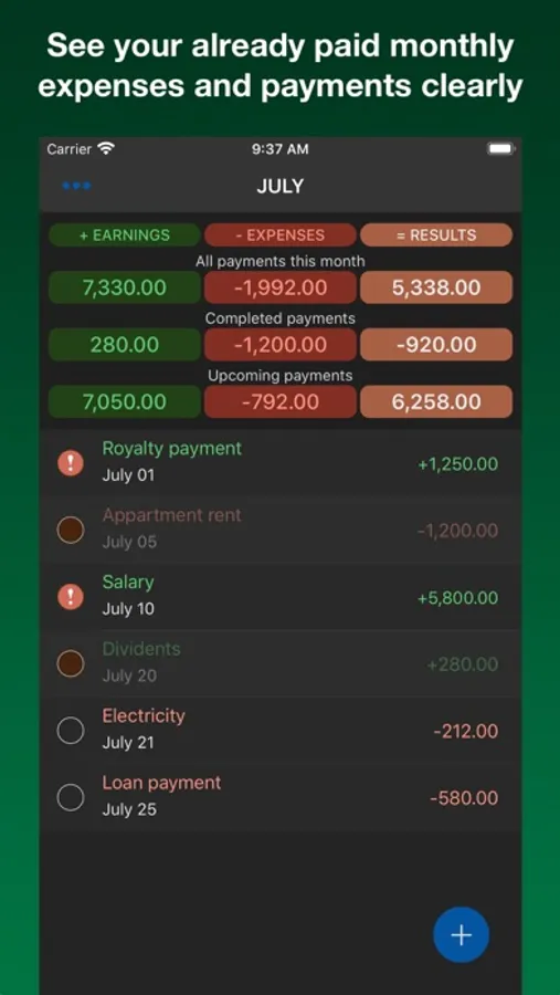 Enter your monthly income or any income you earn throughout the month within the app. The income are highlighted in green color.