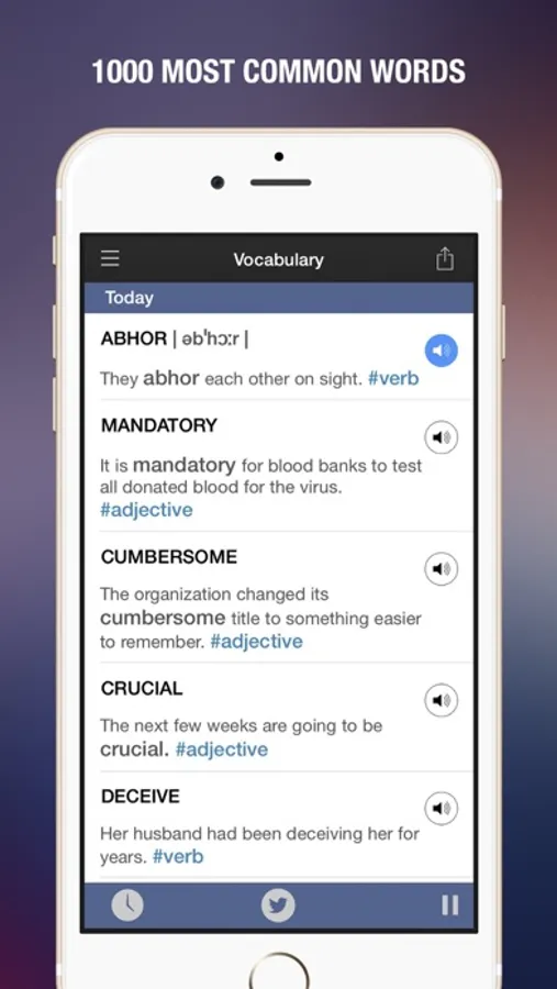 - All words have audio and definition of English meaning. Moreover, you can check the recent twitter samples of using the word and translate it to 6 languages (Russian, German, French, Spanish, Italian, Turkish).