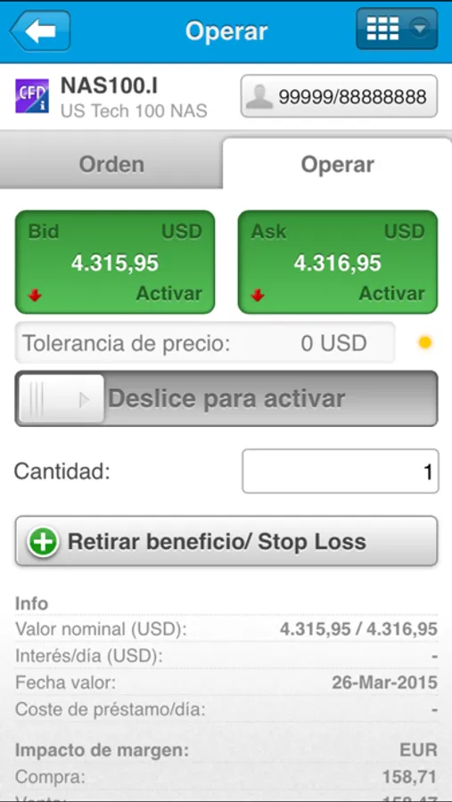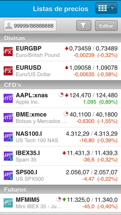 Consulta y opera con tu cuenta de CFDs, Divisas y Futuros de Self Bank. Disfruta de gráficos, cotizaciones, noticias y alertas de precios. Desde esta app puedes operar con los siguientes instrumentos: