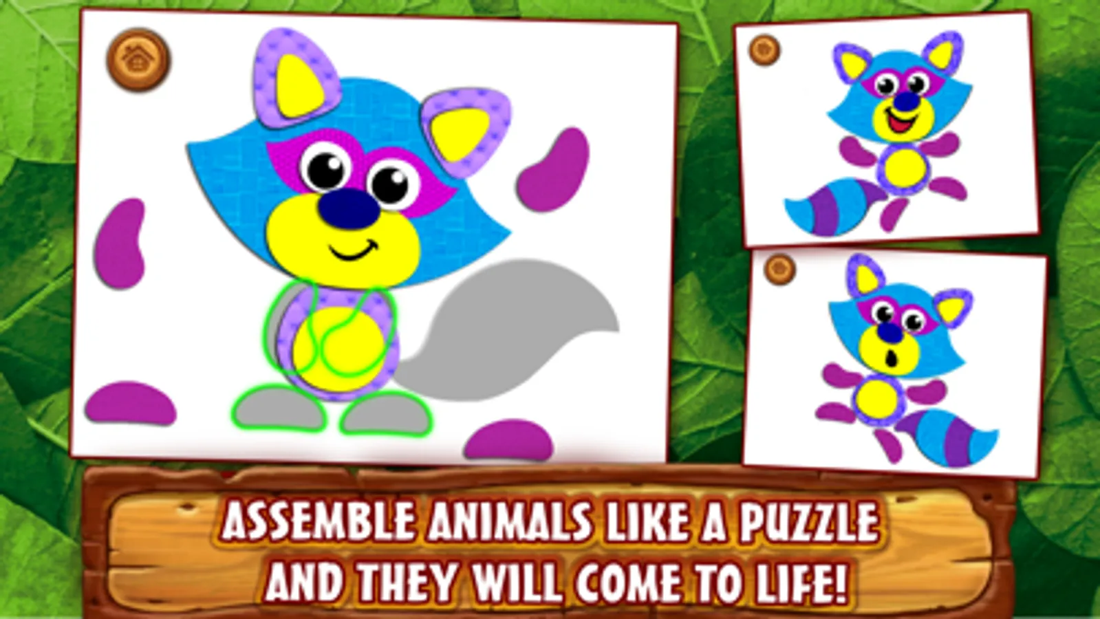 Assemble these cute forest animals out of colorful parts and watch them come to life right under your fingers! Puzzle Game for Kids is a unique assembling game with animation as an added bonus! Forest creatures can't wait to be assembled; they want to jump, roll and have fun! Every one of them has its own little game: you may feed a little Bear with wild strawberries, grow flowers for a Moose, or help a Fox to find a hiding spot... You'll find that and much more in the Puzzle Game for Kids!